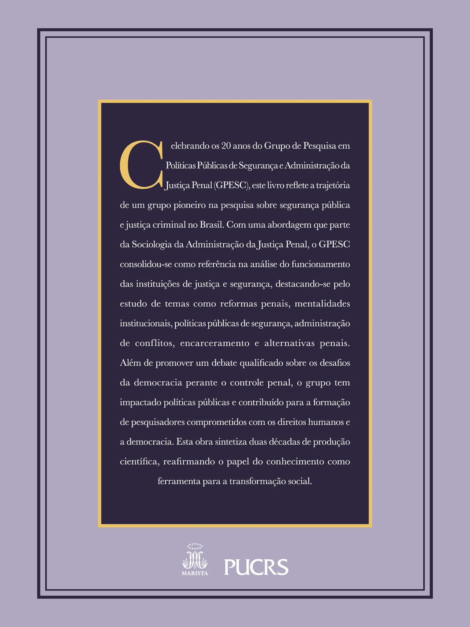 Celebrando os 20 anos do GPESC, este livro reflete a trajetória de um grupo pioneiro na pesquisa sobre segurança pública e justiça criminal no Brasil. Com uma abordagem que parte da Sociologia da Administração da Justiça Penal, o GPESC consolidou-se como referência na análise do funcionamento das instituições de justiça e segurança, destacando-se pelo estudo de temas como reformas penais, mentalidades institucionais, políticas públicas de segurança, administração de conflitos, encarceramento e alternativas penais. Além de promover um debate qualificado sobre os desafios da democracia perante o controle penal, o grupo tem impactado políticas públicas e contribuído para a formação de pesquisadores comprometidos com os direitos humanos e a democracia. Esta obra sintetiza duas décadas de produção científica, reafirmando o papel do conhecimento como ferramenta para a transformação social.