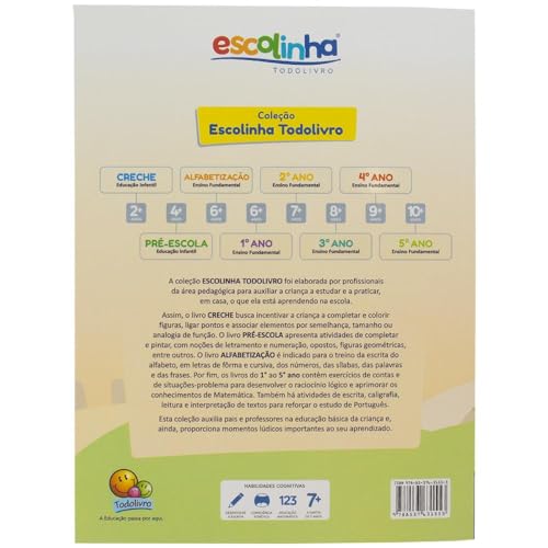A coleção Escolinha Todolivro foi elaborada por profissionais da área pedagógica, de acordo com as diretrizes dos Parâmetros Curriculares Nacionais (PCNs) e tem o intuito de auxiliar a criança a estudar e a praticar, em casa, o que ela está aprendendo na escola. Para tanto, engloba temas tratados no Maternal, no Jardim, na Pré-Escola e do 1º ao 5º ano do Ensino fundamental, divididos em níveis de dificuldade.