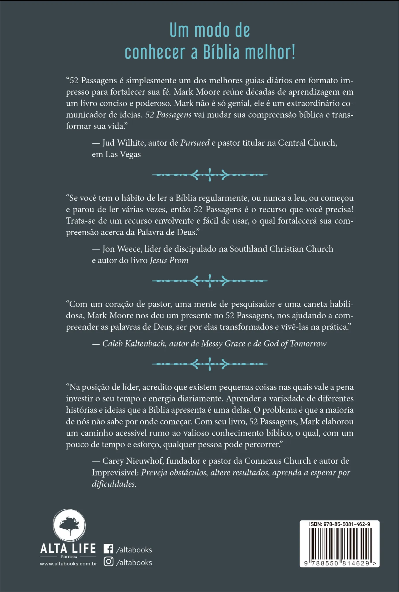 A maioria de nós quer conhecer melhor a Bíblia, mas poucos alcançam esse objetivo, seja por estarmos muito ocupados ou por não sabermos por onde começar. 52 Passagens remove essas barreiras, oferecendo uma solução de senso comum que se encaixa em nossa tão atarefada rotina. Mark E. Moore, respeitado professor bíblico e pastor de ensino, desenvolveu esse comprovado processo por trinta e cinco anos ajudando as pessoas a se aprofundarem na palavra de Deus.
