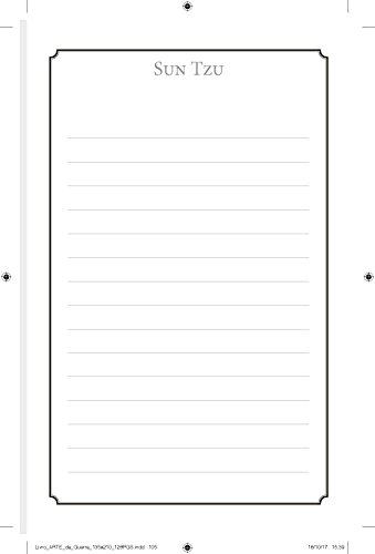 O maior tratado de guerra de todos os tempos em sua versão completa em português. “A Arte da Guerra” é sem dúvida a Bíblia da estratégia, sendo hoje utilizada amplamente no mundo dos negócios, conquistando pessoas e mercados. Não nos surpreende vê-la citada em filmes como Wall Street (Oliver Stone, 1990) e constantemente aplicada para solucionar os mais recentes conflitos do nosso dia-a-dia. Conheça um dos maiores ícones da estratégia dos últimos 2500 anos. Nesta versão brochura de 128 páginas, o livro está no formato 13,5X21. No final da edição o leitor tem 3 espaços para fazer suas anotações sobre aplicabilidades dos ensinamentos de Sun Tzu na vida pessoal, profissional, e nos estudos. Sunzi disse: “A guerra se baseia no engano, se faz pelo ganho e se adapta pela divisão e combinação. ” “Tal como a água procura as profundezas e evita os cumes, um exército ataca o vazio e evita o cheio. A água se move de acordo com a terra; um exército se movimenta de acordo com o inimigo. ” “Quando o general é fraco, sem autoridade junto aos soldados, suas regras são confusas e sua moral é baixa, o exército é confuso. ”