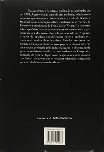 A arte moderna na Europa – De Hogarth a Picasso é uma coletânea de artigos de Giulio Carlo Argan organizada por seu aluno Bruno Contardi. Os textos aqui reunidos tratam da arte e da crítica na modernidade. São textos independentes organizados como uma história e uma genealogia da crítica racionalista do autor. Argan confessa que sempre teve o mesmo interesse pelas obras visuais e pelo pensamento sobre elas. Ele trata de uma invenção crítica da pintura inglesa do século XVIII, do impacto do pensamento de Denis Diderot na pintura e da reinvenção da ideia de clássico, do Renascimento e da Antiguidade, por intelectuais e escritores do século XVIII e XIX. No entanto, o estudo das obras é central. São interpretações diversas, de artistas como Joshua Reynolds e Turner; Manet, Paul Klee e Frank Lloyd Wright. O autor também analisa termos correntes no pensamento crítico e reavalia a sua precisão. A pergunta pelas especificidades da criação artística e arquitetônica depois da modernização da Europa organiza toda a obra – um período marcado pelo avanço da indústria, consolidação dos estados nacionais e triunfo da racionalidade científica.