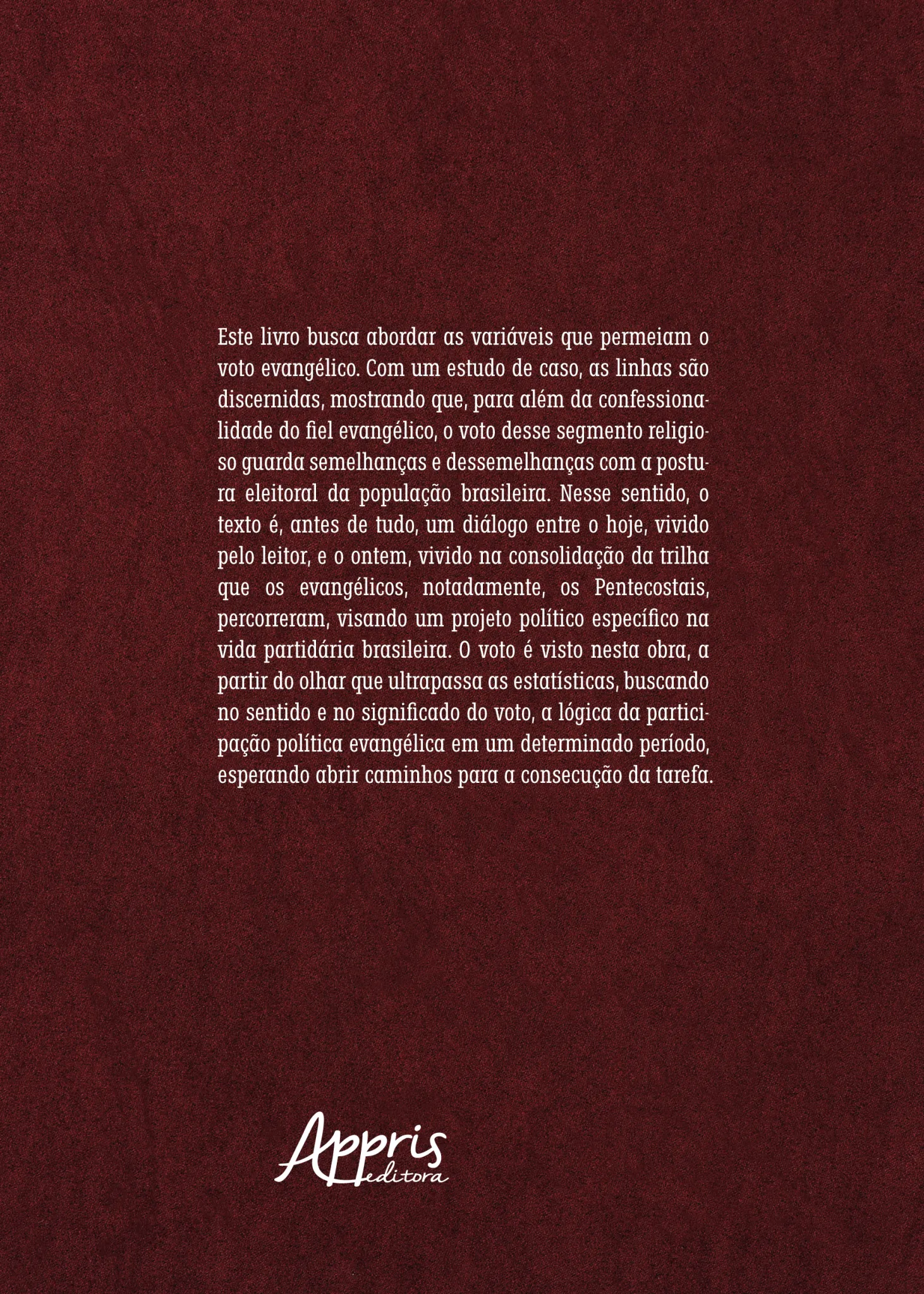 Este livro busca abordar as variáveis que permeiam o voto evangélico. Com um estudo de caso, as linhas são discernidas, mostrando que, para além da confessionalidade do fiel evangélico, o voto desse segmento religioso guarda semelhanças e dessemelhanças com a postura eleitoral da população brasileira. Nesse sentido, o texto é, antes de tudo, um diálogo entre o hoje, vivido pelo leitor, e o ontem, vivido na consolidação da trilha que os evangélicos, notadamente, os Pentecostais, percorreram, visando um projeto político específico na vida partidária brasileira. O voto é visto nesta obra, a partir do olhar que ultrapassa as estatísticas, buscando no sentido e no significado do voto, a lógica da participação política evangélica em um determinado período, esperando abrir caminhos para a consecução da tarefa.
