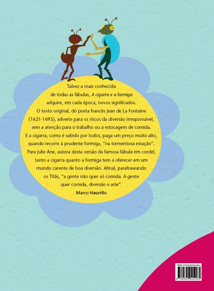 Nesta recriação em cordel da clássica fábula de La Fontaine (1621-1695), Julie Ane faz o leitor acreditar que tanto a Cigarra quanto a Formiga têm muito a oferecer, em um mundo carente de boa diversão e de solidariedade.