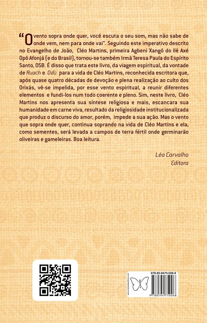 Livro-testemunho de Cléo Martins, que pode ser lido como o relato pessoal de sua experiência de vida, uma viagem densa e profunda em sua busca espiritual desde a mais tenra juventude, pode também ser compreendido como um relato da dificuldade que algumas instituições religiosas ainda têm para abrir-se ao que o Espírito de Deus quer nos dizer através da experiência do outro, seja da outra pessoa que procura, seja do outro como a comunidade de uma religião ou espiritualidade diferente.