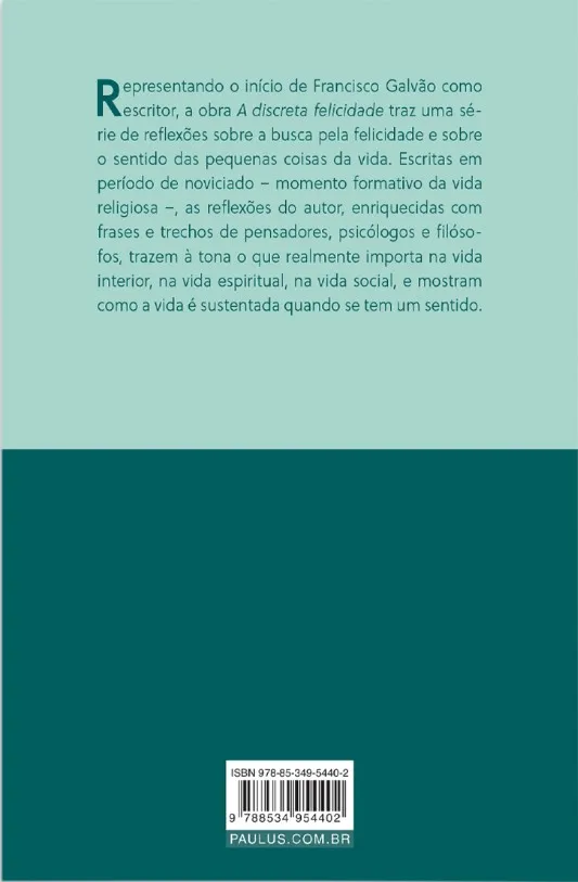 Representando o início de Francisco Galvão como escritor, a obra Discreta felicidade traz uma série de reflexões sobre a busca pela felicidade e sobre o sentido das pequenas coisas da vida. Escritas em período de noviciado – momento formativo da vida religiosa –, as reflexões do autor, enriquecidas com frases e trechos de pensadores, psicólogos e filósofos, trazem à tona o que realmente importa na vida interior, na vida espiritual, na vida social, e de como a vida é sustentada quando se tem um sentido.