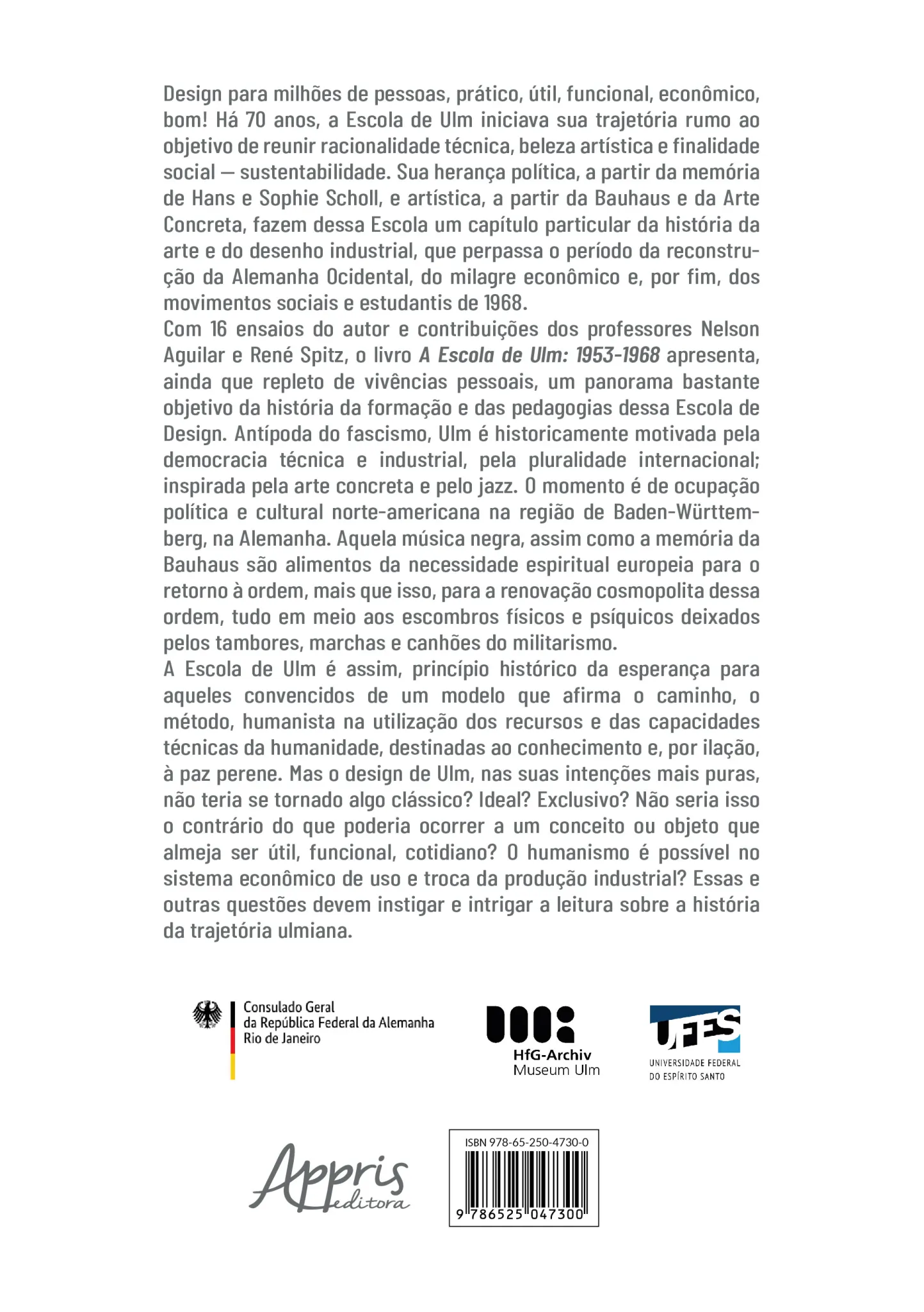 Design para milhões de pessoas, prático, útil, funcional, econômico, bom! Há 70 anos, a Escola de Ulm iniciava sua trajetória rumo ao objetivo de reunir racionalidade técnica, beleza artística e finalidade social — sustentabilidade. Sua herança política, a partir da memória de Hans e Sophie Scholl, e artística, a partir da Bauhaus e da Arte Concreta, fazem dessa Escola um capítulo particular da história da arte e do desenho industrial, que perpassa o período da reconstrução da Alemanha Ocidental, do milagre econômico e, por fim, dos movimentos sociais e estudantis de 1968. Com 16 ensaios do autor e contribuições dos professores Nelson Aguilar e René Spitz, o livro A Escola de Ulm: 1953-1968 apresenta, ainda que repleto de vivências pessoais, um panorama bastante objetivo da história da formação e das pedagogias dessa Escola de Design. Antípoda do fascismo, Ulm é historicamente motivada pela democracia técnica e industrial, pela pluralidade internacional; inspirada pela arte concreta e pelo jazz. O momento é de ocupação política e cultural norte-americana na região de Baden-Württemberg, na Alemanha. Aquela música negra, assim como a memória da Bauhaus são alimentos da necessidade espiritual europeia para o retorno à ordem, mais que isso, para a renovação cosmopolita dessa ordem, tudo em meio aos escombros físicos e psíquicos deixados pelos tambores, marchas e canhões do militarismo. A Escola de Ulm é assim, princípio histórico da esperança para aqueles convencidos de um modelo que afirma o caminho, o método, humanista na utilização dos recursos e das capacidades técnicas da humanidade, destinadas ao conhecimento e, por ilação, à paz perene. Mas o design de Ulm, nas suas intenções mais puras, não teria se tornado algo clássico? Ideal? Exclusivo? Não seria isso o contrário do que poderia ocorrer a um conceito ou objeto que almeja ser útil, funcional, cotidiano? O humanismo é possível no sistema econômico de uso e troca da produção industrial? Essas e outras questões devem instigar e intrigar a leitura sobre a história da trajetória ulmiana.