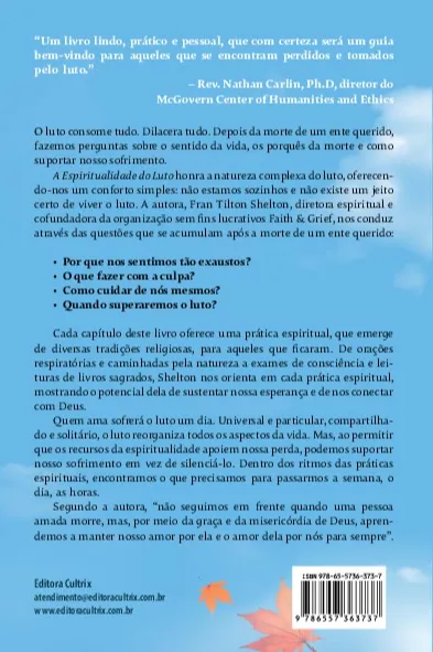 Fran Tilton Shelton, diretora espiritual da Faith & Grief, guia o leitor pelas questões do luto: esgotamento, culpa, autocuidado e superação. Cada capítulo apresenta práticas espirituais (orações, caminhadas etc.) para sustentar a esperança e a conexão com o divino.