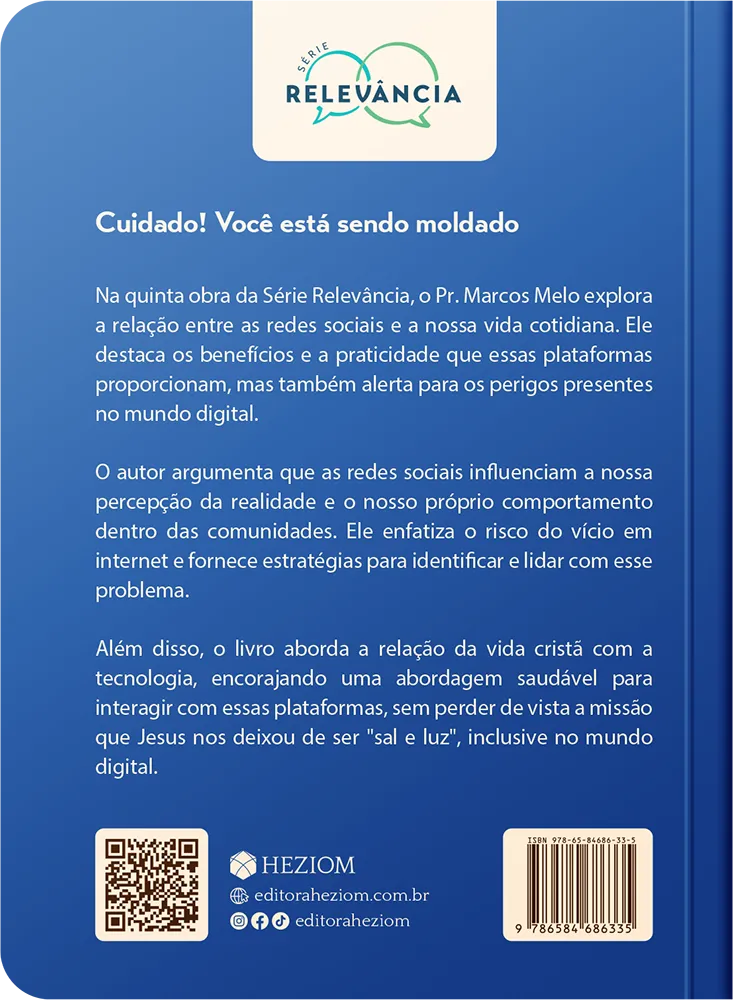 Na quinta obra da Série Relevância, o Pr. Marcos Melo explora a relação entre as redes sociais e a nossa vida cotidiana. Ele destaca os benefícios e a praticidade que essas plataformas proporcionam, mas também alerta para os perigos presentes no mundo digital. O autor argumenta que as redes sociais influenciam a percepção da realidade e de nosso comportamento dentro das comunidade. Ele enfatiza o risco do vício em internet e fornece estratégias para identificar e lidar com esse problema. Além disso, o livro aborda a relação da vida cristã com a tecnologia, encorajando uma abordagem saudável para interagir com essas plataformas sem perder de vista a missão que Jesus nos deixou de ser “sal e luz”, e isso inclui o mundo digital.