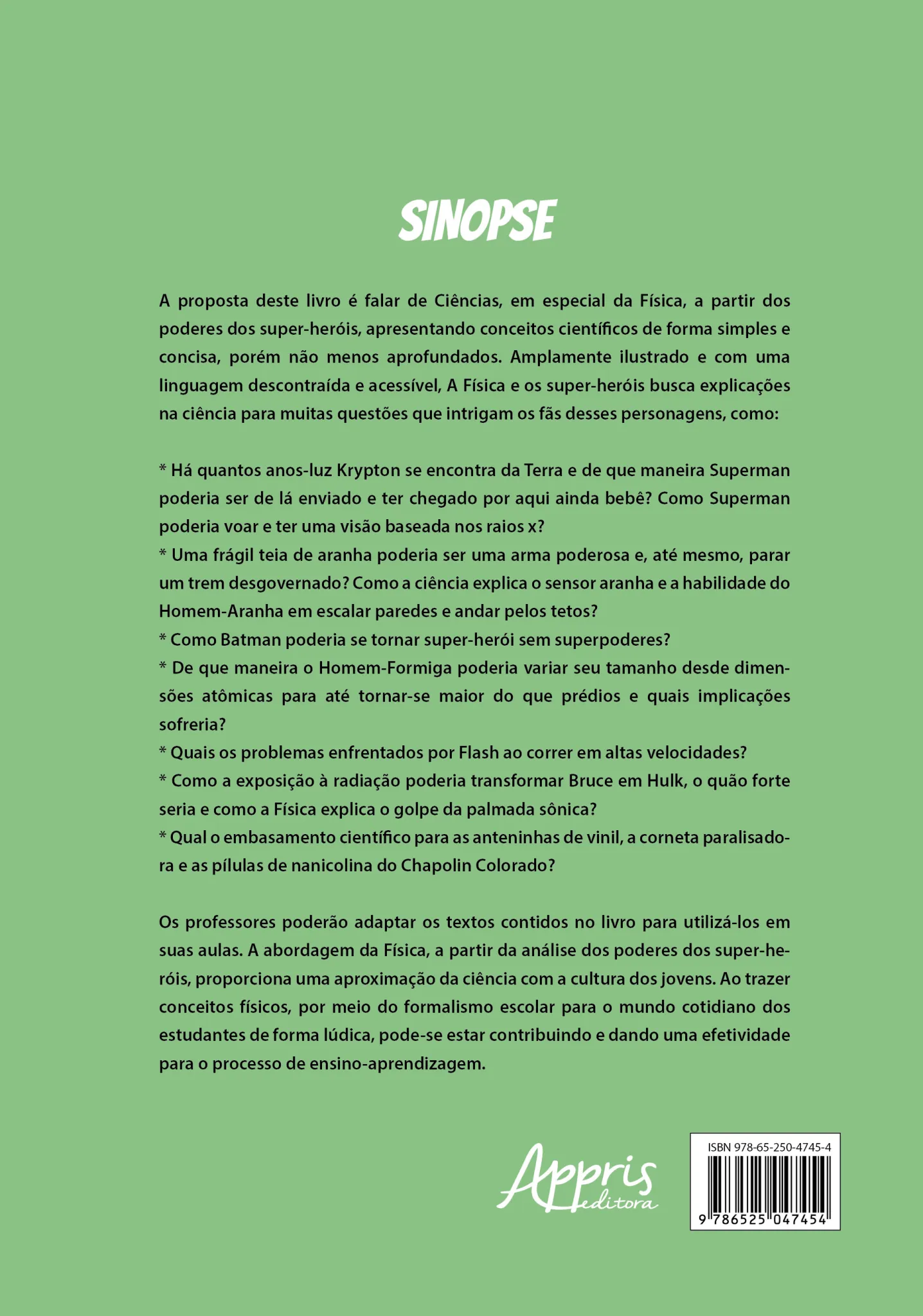 A proposta deste livro é falar de Ciências, em especial da Física, a partir dos poderes dos super-heróis, apresentando conceitos cientí¬cos de forma simples e concisa, porém não menos aprofundados. Amplamente ilustrado e com uma linguagem descontraída e acessível, A Física e os super-heróis busca explicações na ciência para muitas questões que intrigam os fãs desses personagens, como: * Há quantos anos-luz Krypton se encontra da Terra e de que maneira Superman poderia ser de lá enviado e ter chegado por aqui ainda bebê? Como Superman poderia voar e ter uma visão baseada nos raios x? * Uma frágil teia de aranha poderia ser uma arma poderosa e, até mesmo, parar um trem desgovernado? Como a ciência explica o sensor aranha e a habilidade do Homem-Aranha em escalar paredes e andar pelos tetos? * Como Batman poderia se tornar super-herói sem superpoderes? * De que maneira o Homem-Formiga poderia variar seu tamanho desde dimensões atômicas para até tornar-se maior do que prédios e quais implicações sofreria? * Quais os problemas enfrentados por Flash ao correr em altas velocidades? * Como a exposição à radiação poderia transformar Bruce em Hulk, o quão forte seria e como a Física explica o golpe da palmada sônica? * Qual o embasamento cientí¬co para as anteninhas de vinil, a corneta paralisadora e as pílulas de nanicolina do Chapolin Colorado? Os professores poderão adaptar os textos contidos no livro para utilizá-los em suas aulas. A abordagem da Física, a partir da análise dos poderes dos super-heróis, proporciona uma aproximação da ciência com a cultura dos jovens. Ao trazer conceitos físicos, por meio do formalismo escolar para o mundo cotidiano dos estudantes de forma lúdica, pode-se estar contribuindo e dando uma efetividade para o processo de ensino-aprendizagem.