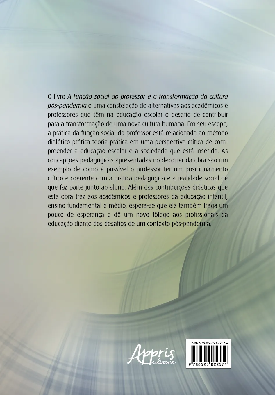 O livro A função social do professor e a transformação da cultura pós-pandemia é uma constelação de alternativas aos acadêmicos e professores que têm na educação escolar o desafio de contribuir para a transformação de uma nova cultura humana. Em seu escopo, a prática da função social do professor está relacionada ao método dialético prática-teoria-prática em uma perspectiva crítica de compreender a educação escolar e a sociedade que está inserida. As concepções pedagógicas apresentadas no decorrer da obra são um exemplo de como é possível o professor ter um posicionamento crítico e coerente com a prática pedagógica e a realidade social de que faz parte junto ao aluno. Além das contribuições didáticas que esta obra traz aos acadêmicos e professores da educação infantil, ensino fundamental e médio, espera-se que esta também traga um pouco de esperança e dê um novo folego aos profissionais da educação diante dos desafios de um contexto pós-pandemia.