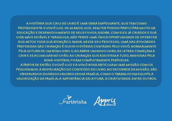 A HISTÓRIA QUE CAIU DO LIVRO É UMA OBRA EMPOLGANTE, QUE TEM COMO PROTAGONISTA O VOVÔ LUIZ, DE 68 ANOS, QUE, SEM TER PODIDO PARTICIPAR MUITO DA EDUCAÇÃO E DESENVOLVIMENTO DE SEUS FILHOS, AGORA, COM ELES JÁ CRIADOS E SUA VIDA MAIS ESTÁVEL E TRANQUILA, NÃO PERDE UMA ÚNICA OPORTUNIDADE DE OFERECER AOS NETOS TODA SUA ATENÇÃO E AMOR. NESSE SEU PROCESSO, UMA DAS ATIVIDADES PREFERIDAS DAS CRIANÇAS É OUVIR HISTÓRIAS CONTADAS PELO VOVÔ, NORMALMENTE PELA LEITURA DE UM BOM LIVRO. E, AO ABRIR UM NOVO LIVRO, AS LETRAS COMEÇAM A CAIR E SE ACUMULAR NO CHÃO. AS CRIANÇAS QUE ASSISTEM A TUDO, ANSIOSAS PELA NOVA HISTÓRIA, FICAM COMPLETAMENTE PERPLEXAS. A PARTIR DE ENTÃO, O VOVÔ LUIZ E A VOVÓ ROSA ARTICULAM UMA MISSÃO COM OS PEQUENINOS: A RESTAURAÇÃO DO CONTEÚDO DO LIVRO. NO DECORRER DA MISSÃO, SÃO OBSERVADOS DIVERSOS VALORES DESSA FAMÍLIA, COMO O TRABALHO EM EQUIPE, A VALORIZAÇÃO DA FAMÍLIA, A IMPORTÂNCIA DA LEITURA, A CRIATIVIDADE, ENTRE OUTROS.