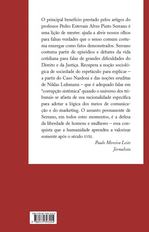 Serrano parte de episódios e debates da vida cotidiana para falar de grandes dificuldades do Direito e da Justiça. Recupera a noção sociológica de sociedade do espetáculo para explicar – a partir do Caso Nardoni e das noções eruditas de Niklas Luhmann – que é adequado falar em “corrupção sistêmica” quando o universo dos tribunais se afasta de sua racionalidade específica para adotar a lógica dos meios de comunicação e do marketing.
