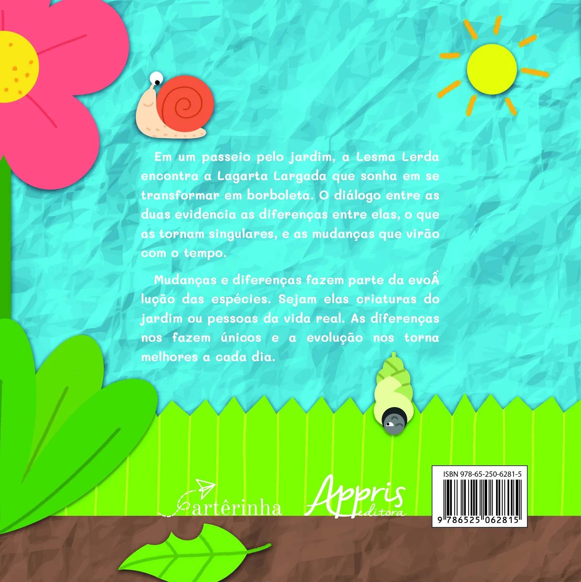 Em um passeio pelo jardim, a Lesma Lerda encontra a Lagarta Largada que sonha em se transformar em borboleta. O diálogo entre as duas evidencia as diferenças entre elas, o que as tornam singulares, e as mudanças que virão com o tempo. Mudanças e diferenças fazem parte da evolução das espécies. Sejam elas criaturas do jardim ou pessoas da vida real. As diferenças nos fazem únicos e a evolução nos torna melhores a cada dia.