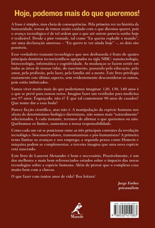 Esse verdadeiro tsunami tecnológico que nos desbussola é fruto de quarto principais domínios tecnocientíficos agrupados na sigla NBIC: nanotecnologia, biotecnologia, informática e cognitividade. As mudanças se fazem sentir em todas as áreas de nossas vidas, do nascimento, passando pela educação, pelo amor, pela profissão, pelo lazer, pela família até a morte. Este livro privilegia exatamente este último aspecto, sem evidentemente desconsiderar os outros, pois estão imbricados.