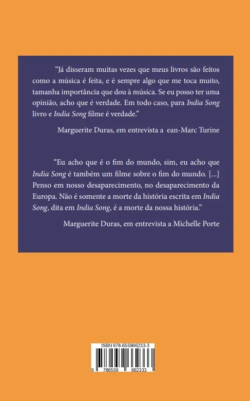 Tudo isso é orquestrado com uma espantosa precisão técnica, que faz pensar no teatro de Beckett, no cinema de Resnais e Marker – e, sobretudo, na música de Bach, Beethoven e Berio. Que India Song seja ao mesmo tempo tão visceral e tão cerebral é um dos enigmas que este livro se esforça por clarificar. Procurou-se, entretanto, evitar que a análise se torne uma dissecação, que mata e esquarteja o ser vivo que estuda; ao contrário, a busca constante foi de que a obra de Duras se mostre cada vez mais viva e apaixonante à medida que a intimidade com ela se aprofunde.