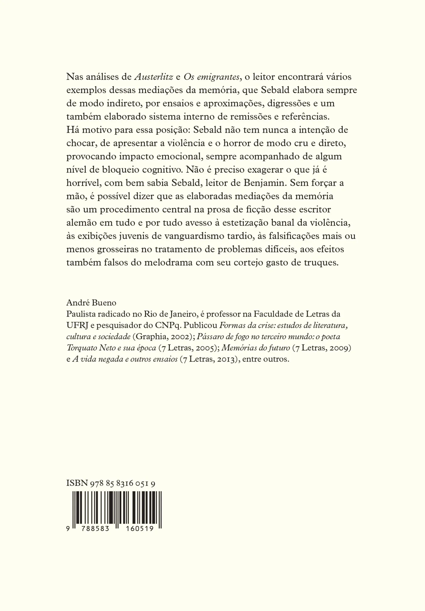 Nas análises de Austerlitz e Os emigrantes, o leitor encontrará vários exemplos dessas mediações da memória, que Sebald elabora sempre de modo indireto, por ensaios e aproximações, digressões e um também elaborado sistema interno de remissões e referências. Há motivo para essa posição: Sebald não tem nunca a intenção de chocar, de apresentar a violência e o horror de modo cru e direto, provocando impacto emocional, sempre acompanhado de algum nível de bloqueio cognitivo. Não é preciso exagerar o que já é horrível, com bem sabia Sebald, leitor de Benjamin. Sem forçar a mão, é possível dizer que as elaboradas mediações da memória são um procedimento central na prosa de ficção desse escritor alemão em tudo e por tudo avesso à estetização banal da violência, às exibições juvenis de vanguardismo tardio, às falsificações mais ou menos grosseiras no tratamento de problemas difíceis, aos efeitos também falsos do melodrama com seu cortejo gasto de truques.