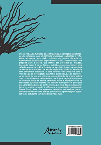 O livro intitulado A prática docente para aprendizagem significativa do estudante com deficiência intelectual: subsídios e reflexões apresenta uma visão holística da prática docente no Atendimento Educacional Especializado (AEE), considerando uma proposta para a escola que atenda aos preceitos da inclusão, buscando trazer à luz de teorias, subsídios que proporcionem uma reflexão acerca da prática docente na escola inclusiva, na premissa de favorecer o processo de escolarização e inclusão do estudante com deficiência intelectual. A obra delineia uma pesquisa com a metodologia da investigação qualitativa-participativa, e se desenvolve ao longo de um ano letivo na prática docente da própria autora que, como professora pesquisadora, participa e registra o processo de vivência diária da escola, refletindo sobre a importância de se considerar a prática docente, um trabalho alicerçado em princípios que valorizam a busca do conhecimento por meio de preceitos como: teoria e prática, respeito à diferença e organização pedagógica. Dessa forma, esta obra apresenta requisitos necessários para o desenvolvimento de uma prática com vistas à aprendizagem significativa do estudante com deficiência intelectual