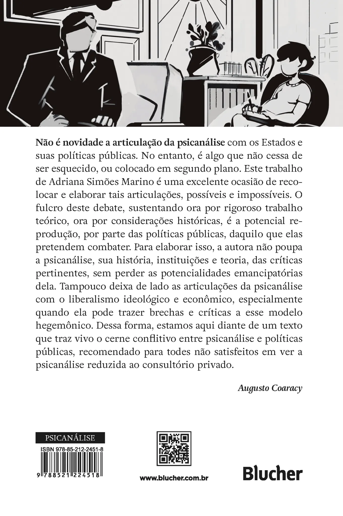 Não é novidade a articulação da psicanálise com os Estados e suas políticas públicas. No entanto, é algo que não cessa de ser esquecido, ou colocado em segundo plano. Este trabalho de Adriana Simões Marino é uma excelente ocasião de recolocar e elaborar tais articulações, possíveis e impossíveis. O fulcro deste debate, sustentando ora por rigoroso trabalho teórico, ora por considerações históricas, é a potencial reprodução, por parte das políticas públicas, daquilo que elas pretendem combater. Para elaborar isso, a autora não poupa a psicanálise, sua história, instituições e teoria, das críticas pertinentes, sem perder as potencialidades emancipatórias dela. Tampouco deixa de lado as articulações da psicanálise com o liberalismo ideológico e econômico, especialmente quando ela pode trazer brechas e críticas a esse modelo hegemônico. Dessa forma, estamos aqui diante de um texto que traz vivo o cerne conflitivo entre psicanálise e políticas públicas, recomendado para todes não satisfeitos em ver a psicanálise reduzida ao consultório privado.Augusto Coaracy