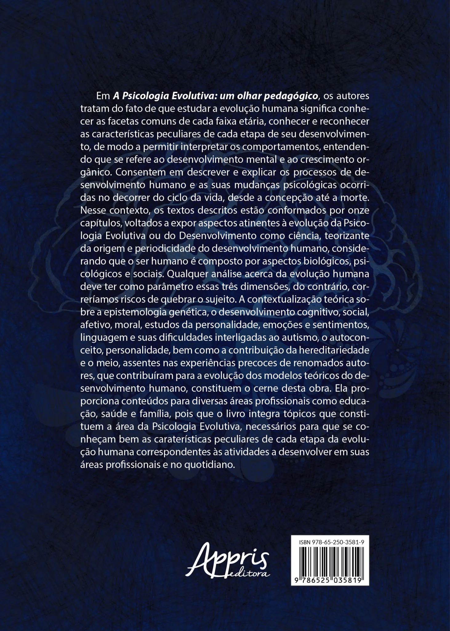 Em A Psicologia Evolutiva: um olhar pedagógico, os autores tratam do fato de que estudar a evolução humana signi fica conhecer as facetas comuns de cada faixa etária, conhecer e reconhecer as características peculiares de cada etapa de seu desenvolvimento, de modo a permitir interpretar os comportamentos, entendendo que se refere ao desenvolvimento mental e ao crescimento orgânico. Consentem em descrever e explicar os processos de desenvolvimento humano e as suas mudanças psicológicas ocorridas no decorrer do ciclo da vida, desde a concepção até a morte. Nesse contexto, os textos descritos estão conformados por onze capítulos, voltados a expor aspectos atinentes à evolução da Psicologia Evolutiva ou do Desenvolvimento como ciência, teorizante da origem e periodicidade do desenvolvimento humano, considerando que o ser humano é composto por aspectos biológicos, psicológicos e sociais. Qualquer análise acerca da evolução humana deve ter como parâmetro essas três dimensões, do contrário, correríamos riscos de quebrar o sujeito. A contextualização teórica sobre a epistemologia genética, o desenvolvimento cognitivo, social, afetivo, moral, estudos da personalidade, emoções e sentimentos, linguagem e suas di ficuldades interligadas ao autismo, o autoconceito, personalidade, bem como a contribuição da hereditariedade e o meio, assentes nas experiências precoces de renomados autores, que contribuíram para a evolução dos modelos teóricos do desenvolvimento humano, constituem o cerne desta obra. Ela proporciona conteúdos para diversas áreas profi ssionais como educação, saúde e família, pois que o livro integra tópicos que constituem a área da Psicologia Evolutiva, necessários para que se conheçam