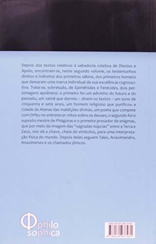 Depois dos textos relativos à sabedoria coletiva de Dioniso e Apolo, encontram-se, neste segundo volume, os testemunhos diretos e indiretos dos primeiros sábios, dos primeiros homens que deixaram uma marca individual da sua excelência cognoscitiva. Trata-se, sobretudo, de Epimênides e Ferécides, dois personagens apolíneos: o primeiro foi um adivinho do futuro e do passado, um xamã que dormiu – dizem os textos – um sono de cinquenta e sete anos, um homem religioso que purificou a cidade de Atenas das maldições divinas, um poeta que compete com Orfeu no entretecer mitos sobre os deuses; o segundo foi o suposto mestre de Pitágoras e o primeiro prosador de enigmas, que por meio da imagem das “sagradas núpcias” entre a Terra e Zeus, nos dá a chave, cheia de símbolos, para uma interpretação física do mundo. Depois deles seguem Tales, Anaximandro, Anaxímenes e os chamados jônicos.
