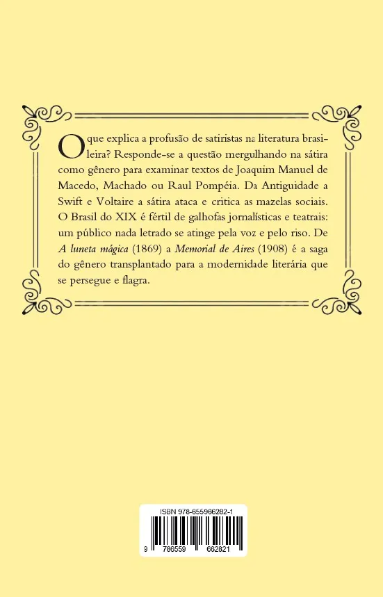 Neste livro, tenta-se responder a tal questão pela história concreta: num país de pouquíssimos leitores, teatro e jornais apostaram na leveza cômica e na crítica desbragada para atingir público amplo. A transposição do clima político galhofeiro europeu é um pedaço da história. O importante é percorrer obras de Macedo (A luneta mágica), Machado (Memorial de Aires, Pílades e Orestes…) e Raul Pompéia (O Ateneu) para flagrar a fabulação satírica transmudada para solo e alma brasileiros. Bem como traços da raiva e do riso devotados à impostura de alpinistas sociais e meritocráticos – eis a Teoria do medalhão, o Alienista, os homens que sabem javanês e a sociedade que condena Policarpo Quaresma pelo crime de… idealismo. Eis a saga completa.