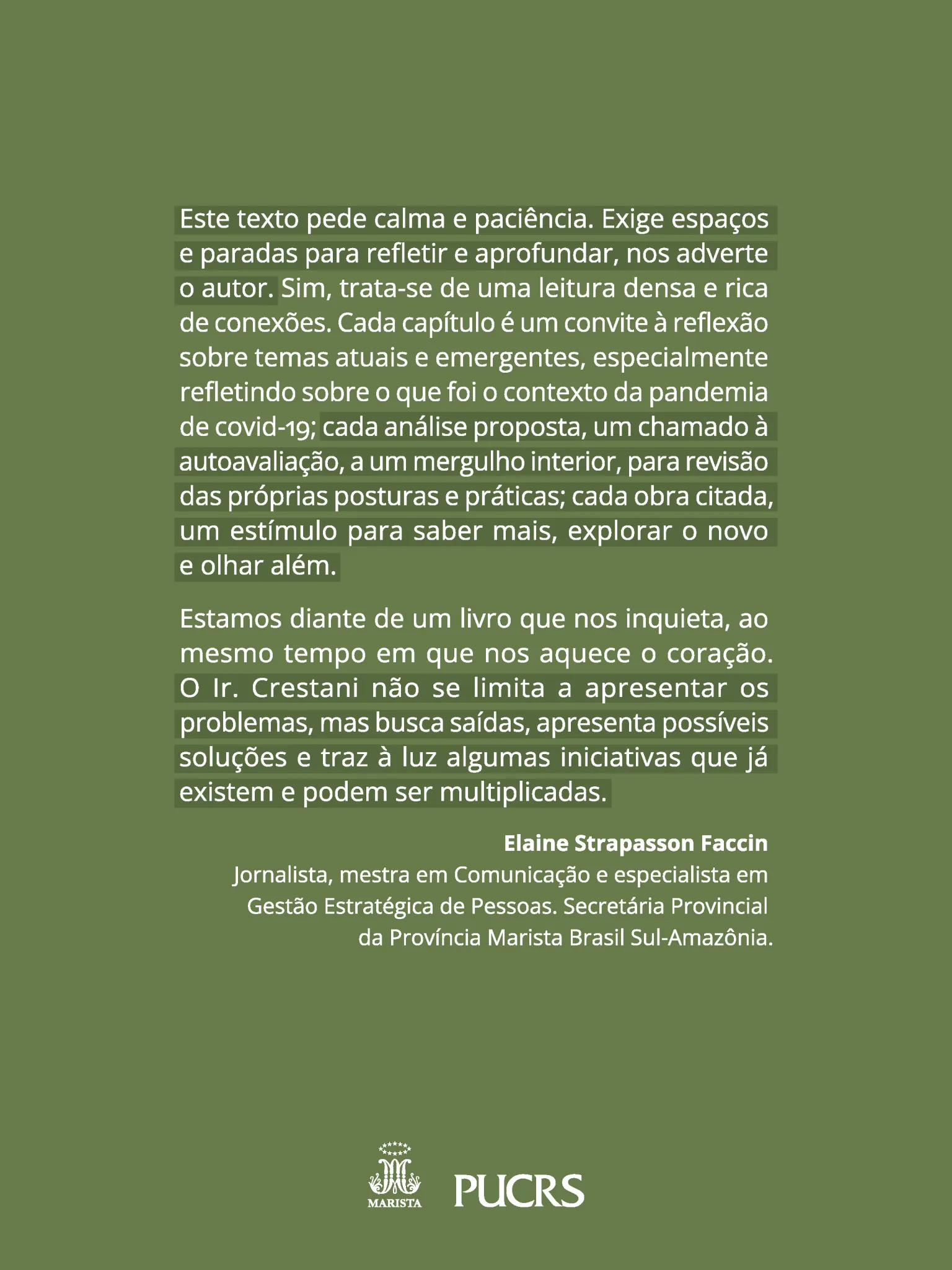 Em uma análise muito bem embasada, fraterna e solidária, Ir. Alfredo Crestani nos apresenta possibilidades, diálogos e reflexões para a construção da sociedade do amanhã – que clama, cada vez mais, por seres humanos resilientes, criativos e empáticos. Uma sociedade em que, desde cedo, as pessoas sejam educadas para a sensibilidade ao outro, para o respeito às diferenças, para a simplicidade e para o equilíbrio.
