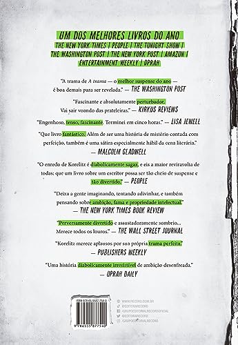 Um escritor fracassado se torna best-seller com uma história roubada de um aluno arrogante. O que poderia dar errado? A trama é um engenhoso suspense psicológico sobre um livro bom demais para não ser publicado. Jacob Finch Bonner já foi um jovem e promissor romancista, com um primeiro livro publicado por uma editora respeitável. Hoje, ele é professor de escrita criativa em um curso de quinta categoria e luta para manter o que lhe resta de respeito próprio. Ele não escreve — muito menos publica — nada bom há anos. Quando Evan Parker, seu aluno mais arrogante, anuncia que não precisa da ajuda de Jacob porque o enredo do livro que está escrevendo é sucesso garantido, o primeiro impulso do professor é descartar a afirmação como um típico arroubo narcisista. Mas então… ele ouve o tal enredo. Jacob retorna à trajetória descendente de sua própria carreira e se prepara para a publicação bombástica do primeiro romance de Evan Parker, mas isso nunca acontece. Quando Jacob descobre que seu ex-aluno morreu sem terminar o livro, faz o que qualquer escritor que se preze faria com uma história como essa — uma história que precisa ser contada de qualquer maneira. Ele rouba a ideia. Em poucos anos, todas as previsões de Evan Parker se tornam realidade, mas é Jacob o autor que aproveita a onda. Ele agora é rico, famoso, elogiado e lido no mundo todo. Porém, no auge de sua gloriosa vida nova, chega um e-mail, o primeiro de uma sequência de ataques aterrorizantes e anônimos: “Você é um ladrão”, o e-mail diz. Na tentativa de descobrir quem o está ameaçando e esconder a verdade de seus leitores e seus editores, Jacob começa a investigar e a aprender mais sobre seu falecido aluno — e o que ele descobre o surpreende e o apavora. Quem era Evan Parker e como ele teve a ideia de escrever aquele romance? Qual é a verdadeira história por trás dessa trama? Quem roubou de quem? “A trama de A trama — o melhor suspense do ano — é boa demais para ser revelada.” — The Washington Post “A trama é um dos melhores livros que já li sobre escritores e escrita. Também é daqueles thrillers que devoramos, com o nível de suspense nas alturas. Extraordinário.” — Stephen King “Fascinante e absolutamente perturbador. Vai sair voando das prateleiras.” — Kirkus Reviews “Engenhoso, tenso, fascinante. Terminei em cinco horas.” — Lisa Jewell “Que livro fantástico. Além de ser uma história de mistério contada com perfeição, também é uma sátira especialmente hábil da cena literária.” — Malcolm Gladwell “O enredo de Korelitz é diabolicamente sagaz, e eis a maior reviravolta de todas: que um livro sobre um escritor possa ser tão cheio de suspense e tão divertido.” — People “Deixa a gente imaginando, tentando adivinhar, e também pensando sobre ambição, fama e propriedade intelectual.” — The New York Times Book Review “Perversamente divertido e assustadoramente sombrio… Merece todos os louros.” — The Wall Street Journal “Korelitz merece aplausos por sua própria trama perfeita.” — Publishers Weekly “Uma história diabolicamente irresistível de ambição desenfreada.” — Oprah Daily
