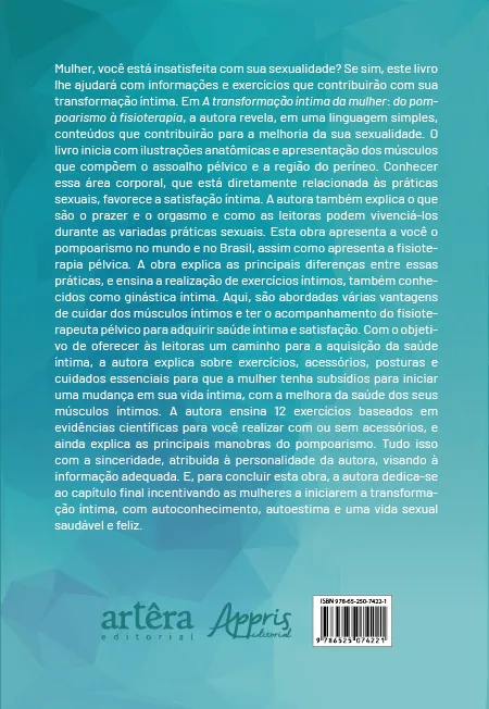 Em A transformação íntima da mulher: do pompoarismo à fisioterapia, a autora revela, em uma linguagem simples, conteúdos que contribuirão para a melhoria da sua sexualidade. O livro inicia com ilustrações anatômicas e apresentação dos músculos que compõem o assoalho pélvico e a região do períneo. Conhecer essa área corporal, que está diretamente relacionada às práticas sexuais, favorece a satisfação íntima. A autora também explica o que são o prazer e o orgasmo e como as leitoras podem vivenciá-los durante as variadas práticas sexuais. Esta obra apresenta a você o pompoarismo no mundo e no Brasil, assim como apresenta a fisioterapia pélvica. A obra explica as principais diferenças entre essas práticas, e ensina a realização de exercícios íntimos, também conhecidos como ginástica íntima. Aqui, são abordadas várias vantagens de cuidar dos músculos íntimos e ter o acompanhamento do fisioterapeuta pélvico para adquirir saúde íntima e satisfação.