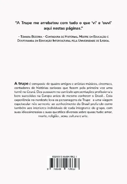 A Trupe é composto por quatro amigos circenses, músicos e contadores de histórias cariocas que fazem pela primeira vez uma turnê no Nordeste, mais especificamente, no Ceará, apesar de já terem tido uma experiência profissional na Europa antes mesmo de conhecer o Brasil. Essa experiência, leva a Trupe à uma viagem espetacular não somente do conhecimento do nosso Brasil profundo como também, aos interiores individuais de cada personagem que integra a Trupe, com suas idiossincrasias, suas questões, seus amores e muitas, mas muitas dúvidas sobre tudo: amor, morte, religião, sexo, cultura e arte. O livro vem com um índice sonoro, onde estão todas as referências musicais citadas e cantadas ao longo do texto. A Trupe segue numa van guiada pelo motorista Raí, cearense nato que é também um exímio contador de Histórias, enquanto leva a Trupe atravessando o sertão. As histórias que ali acontecem no trajeto até a cidade de Larbos, compõe a essência do livro, que aqui se presta à leitura de vocês.