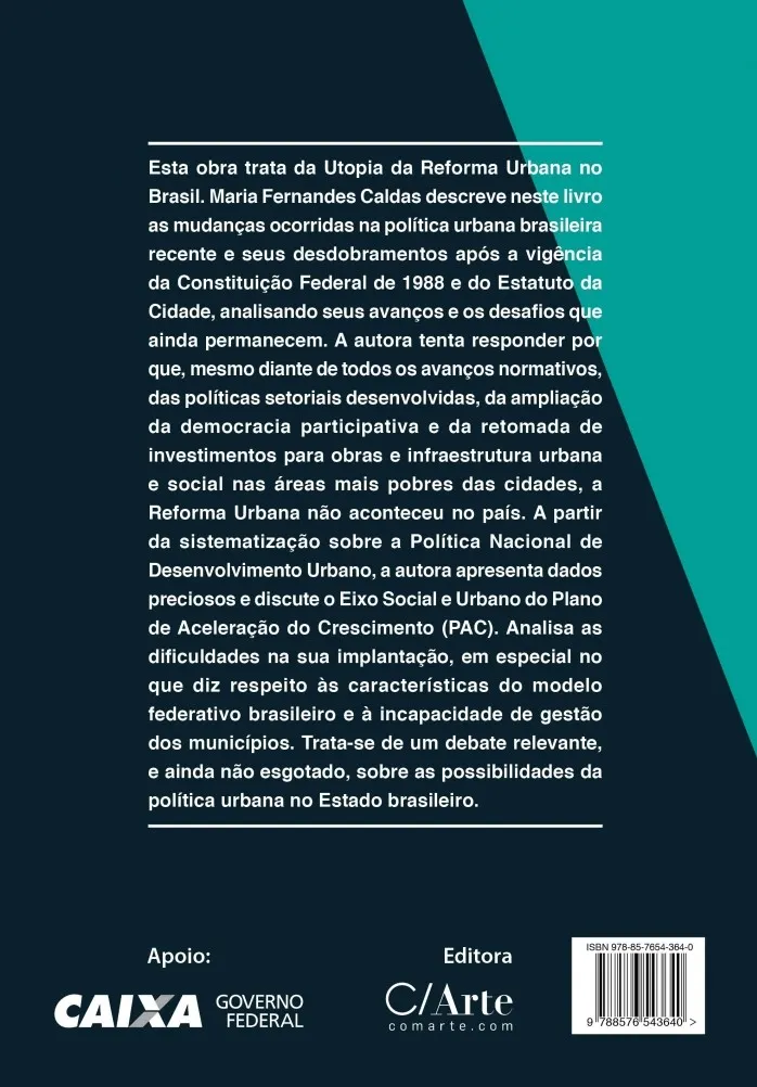 O livro de Maria Fernandes Caldas traz novas luzes para a análise da política urbana brasileira do período recente. Para além da análise do marco legal dessa política, considera atuações a ela associadas: a partir da sistematização sobre a Política Nacional de Desenvolvimento Urbano (PNDU), a autora apresenta dados preciosos relacionados às políticas urbanas implantadas no âmbito do governo federal, desde a criação do Ministério das Cidades, e analisa o Eixo Social e Urbano do Programa de Aceleração do Crescimento (PAC) como um instrumento importante na promoção da justiça social. Trata-se de um debate relevante, e ainda não esgotado, sobre as possibilidades da política urbana no Estado brasileiro sob a vigência da CF1988 e do Estatuto da Cidade. A autora Maria Fernandes Caldas é arquiteta formada pela UFRJ e doutora em arquitetura e urbanismo pela UFMG. Atualmente exerce a função de Secretária de Política Urbana de Belo Horizonte, onde já ocupou outras Secretarias. Foi Diretora de Infraestrutura Urbana e Social do Programa de Aceleração do Crescimento (PAC) no Ministério de Planejamento, Orçamento e Gestão e integrou o Comitê Nacional de Acompanhamento do Programa Minha Casa, Minha Vida e o Conselho Nacional das Cidades.