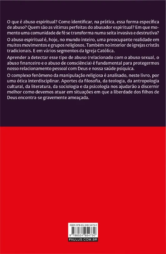 Esta obra analisa o tema do abuso espiritual, comparando-o com outros tipos de abuso, esclarecendo as características da vítima perfeita para o abusador e os truques de manipulação que são usados. O medo incutido no fiel e o complexo de santidade de alguns líderes espirituais confluem para a negação das seitas em se ver como tal, desembocando em fundamentalismos que precisam ser enfrentados sem medo, com discernimento, por meio de uma loucura criativa, erasmiana, capaz de nos afastar da loucura dos fanáticos.