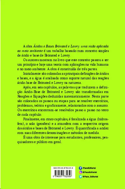 Ácidos e bases de Brönsted e Lawry: uma visão aplicada ao meio ambiente, se baseia na importante teoria da reação ácidos e bases, considerando os estudos dos físico-químicos Brönsted e Lawry. Desse modo, os autores desejam com essa obra, demonstrar como essa teoria se tornou princípio básico não apenas na química e física, mas em diversos outros campos da vida humana, inclusive considerando sua aplicação em estudos sobre o meio ambiente e da natureza em sua totalidade.
