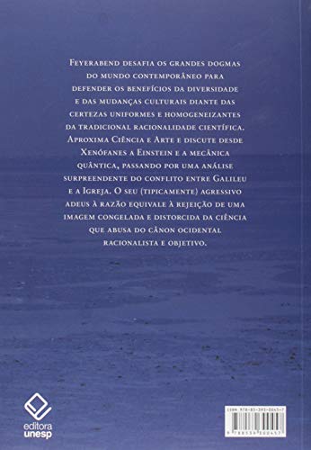 Feyerabend desafia os grandes dogmas do mundo contemporâneo para defender os benefícios da diversidade e das mudanças culturais diante das certezas uniformes e homogeneizantes da tradicional racionalidade científica. Aproxima Ciência e Arte e discute desde Xenófanes a Einstein e a mecânica quântica, passando por uma análise surpreendente do conflito entre Galileu e a Igreja. O seu (tipicamente) agressivo adeus à razão equivale à rejeição de uma imagem congelada e distorcida da ciência que abusa do cânon ocidental racionalista e objetivo.
