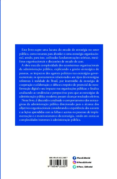 Este livro supre uma lacuna do estudo de estratégia no setor público, como recursos para abordar o tema estratégia organizacional, sendo, para isso, utilizadas fundamentações teóricas, metáforas organizacionais e discussões de estudo de caso. A obra trata da complexidade dos ecossistemas organizacionais da administração pública, explicando a gestão estratégica de pessoas, os impactos dos agentes políticos nas estratégias governamentais; os apontamentos relacionados aos tipos de estratégias referentes à realidade do Brasil, por intermédio da estratégia de cooperação e colaboração; o debate a respeito do potencial da transformação digital e seu impacto nas organizações públicas; e finaliza analisando as tendências e perspectivas para que as estratégias da administração pública moderna possam alcançar resultados efetivos.