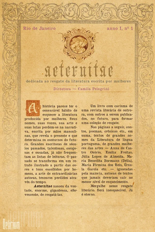 Imagine que exista um livro que reúna tantas obras, que permita assistir às cenas de outrora. Esse é Aeternitae, um livro que visa ao resgate de brilhantes escritoras de outros séculos, que se perderam ao longo do tempo. Conhecer o passado é fundamental. E conhecer a arte produzida por mulheres é sinônimo de resistência, contra uma maré que insiste em deixá-las longe da superfície. Em suma, Aeternitae é um livro com carisma de uma revista literária de outrora.