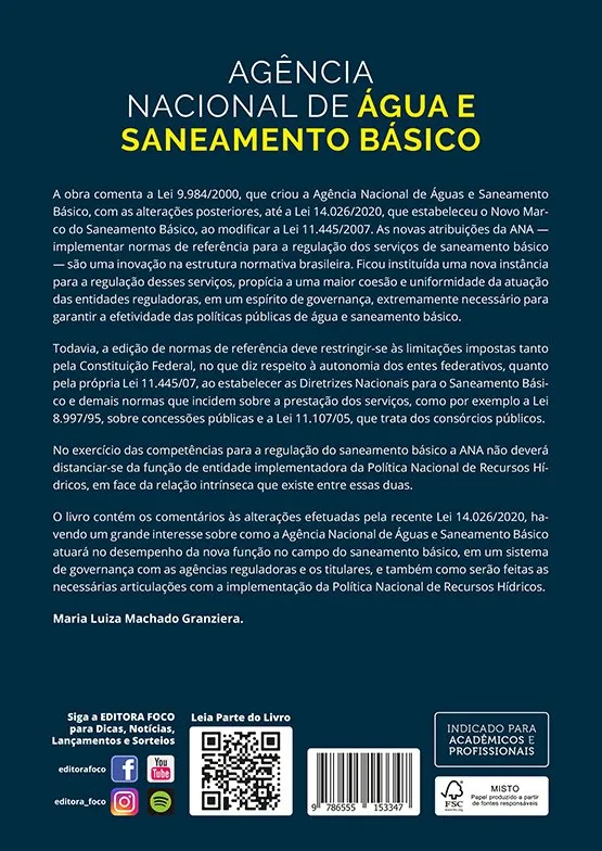 A obra comenta a Lei 9.984/2000, que criou a Agência Nacional de Águas e Saneamento Básico, com as alterações posteriores, até a Lei 14.026/2020, que estabeleceu o Novo Marco do Saneamento Básico, ao modificar a Lei 11.445/2007. As novas atribuições da ANA – implementar normas de referência para a regulação dos serviços de saneamento básico – são uma inovação na estrutura normativa brasileira. Ficou instituída uma nova instância para a regulação desses serviços, propícia a uma maior coesão e uniformidade da atuação das entidades reguladoras, em um espírito de governança, extremamente necessário para garantir a efetividade das políticas públicas de água e saneamento básico.
