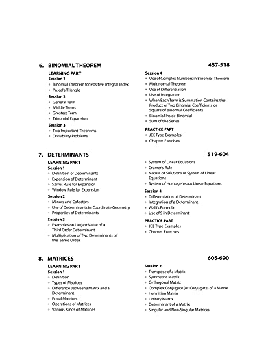 Complex Numbers, Theory of Equations, Sequences and Series, Logarithms and Their Properties, Permutations and Combinations, Binomial Theorems, Determinants, Matrices, Probability, Mathematical Inductions, Sets, Relations and Functions.
