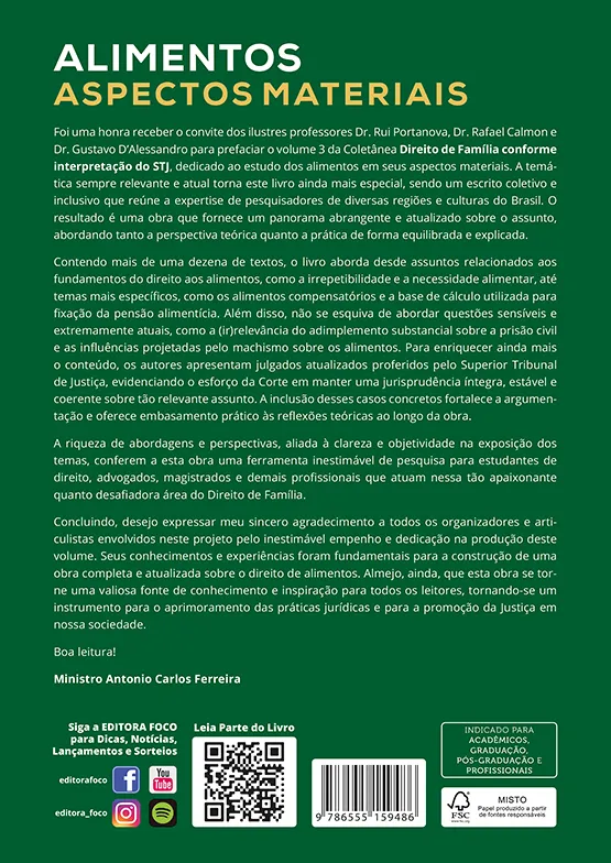 Foi uma honra receber o convite dos ilustres professores Dr. Rui Portanova, Dr. Rafael Calmon e Dr. Gustavo D’Alessandro para prefaciar o volume n. 03 da Coletânea “Direito de Família conforme interpretação do STJ”, dedicado ao estudo dos alimentos em seus aspectos materiais. A temática sempre relevante e atual torna este livro ainda mais especial, sendo um escrito coletivo e inclusivo que reúne a expertise de pesquisadores de diversas regiões e culturas do Brasil. O resultado é uma obra que fornece um panorama abrangente e atualizado sobre o assunto, abordando tanto a perspectiva teórica quanto a prática de forma equilibrada e explicada.