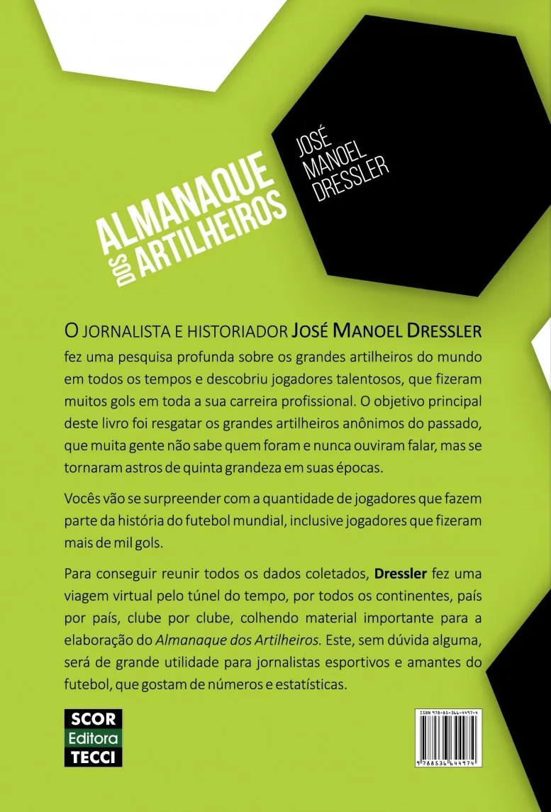 O jornalista e historiador José Manoel Dressler fez uma pesquisa profunda sobre os grandes artilheiros do mundo em todos os tempos e descobriu jogadores talentosos, que fizeram muitos gols em toda a sua carreira profissional. O objetivo principal deste livro foi resgatar os grandes artilheiros anônimos do passado, que muita gente não sabe quem foram e nunca ouviram falar, mas se tornaram astros de quinta grandeza em suas épocas. Vocês vão se surpreender com a quantidade de jogadores que fazem parte da história do futebol mundial, inclusive jogadores que fizeram mais de mil gols. Para conseguir reunir todos os dados coletados, Dressler fez uma viagem virtual pelo túnel do tempo, por todos os continentes, país por país, clube por clube, colhendo material importante para a elaboração do Almanaque dos Artilheiros. Este, sem dúvida alguma, será de grande utilidade para jornalistas esportivos e amantes do futebol, que gostam de números e estatísticas.