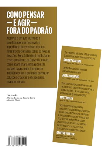 Um livro inusitado e questionador que mostra como é importante resistir ao impulso natural de racionalizar todas as decisões. Para o publicitário Rory Sutherland, abandonar a lógica pode ser a chave para alcançar a origem de insatisfações e, a partir daí, encontrar soluções criativas e eficazes para qualquer desafio. O comportamento humano é um enigma que podemos aprender a decifrar, afirma Rory Sutherland. Utilizando as ferramentas da psicologia comportamental, ele parte da premissa de que devemos ignorar o que as pessoas dizem e nos concentrar no que sentem. Os desafios enfrentados diariamente por profissionais da área de vendas, saúde, logística, telecomunicações e outras podem ser resolvidos com um pensamento menos lógico. E os desdobramentos dessa abordagem são aplicáveis a quase tudo: desde fomentar a venda de determinado produto até aumentar a satisfação das pessoas no transporte público. Sutherland preconiza que atribuir nossos sucessos a um método intencional e científico, minimizando a participação de fatores acidentais ou imprevistos, é uma tendência enganosa que pode limitar nossa capacidade de inovação. Romper essa barreira é difícil, principalmente no ambiente corporativo. De maneira surpreendente e divertida, combinando ciência comportamental de ponta com casos inusitados, Sutherland oferece reflexões poderosas e mostra as vantagens de nos tornarmos verdadeiros alquimistas das ideias. “Ler Alquimia foi, como o título promete, transformar papel impresso em ouro.” — Robert Cialdini, autor de As armas da persuasão “Maravilhosamente herético, atrevido e engraçado.” — Jules Goddard, London Business School “Como um comprometido devoto do racionalismo, racionalmente eu deveria odiar este livro. Em vez disso, amei. Está cheio de grandes insights.” — Matt Ridley, autor de O otimista racional “Sutherland nos ajuda a redescobrir a sabedoria profunda por trás do raciocínio humano cotidiano, e nos convida a explorar a magia que acontece quando confiamos um pouco menos em nossos modelos de otimização e um pouco mais em nossa excentricidade criativa.” — Geoffrey Miller, autor de Darwin vai às compras “Esta leitura ilógica e lógica é obrigatória para qualquer pessoa que esteja no negócio de lidar com pessoas.” — Dilip Soman, Universidade de Toronto “Profundamente original.” — Robert Trivers, biólogo evolucionista