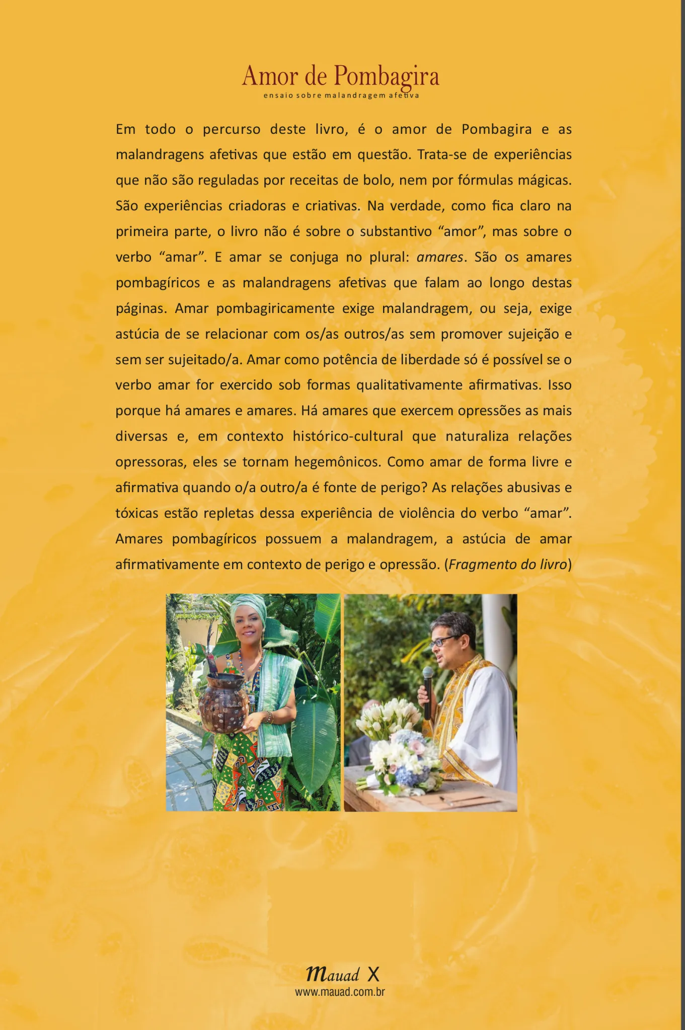 Em todo o percurso deste livro, é o amor de Pombagira e as malandragens afetivas que estão em questão. Trata-se de experiências que não são reguladas por receitas de bolo, nem por fórmulas mágicas. São experiências criadoras e criativas. Na verdade, como fica claro na primeira parte, o livro não é sobre o substantivo “amor”, mas sobre o verbo “amar”. E amar se conjuga no plural: amares. São os amares pombagíricos e as malandragens afetivas que falam ao longo destas páginas. Amar pombagiricamente exige malandragem, ou seja, exige astúcia de se relacionar com os/as outros/as sem promover sujeição e sem ser sujeitado/a. Amar como potência de liberdade só é possível se o verbo amar for exercido sob formas qualitativamente afirmativas. Isso porque há amares e amares. Há amares que exercem opressões as mais diversas e, em contexto histórico-cultural que naturaliza relações opressoras, eles se tornam hegemônicos. Como amar de forma livre e afirmativa quando o/a outro/a é fonte de perigo? As relações abusivas e tóxicas estão repletas dessa experiência de violência do verbo “amar”. Amares pombagíricos possuem a malandragem, a sagacidade de amar afirmativamente em contexto de perigo e opressão. (Fragmento do livro)
