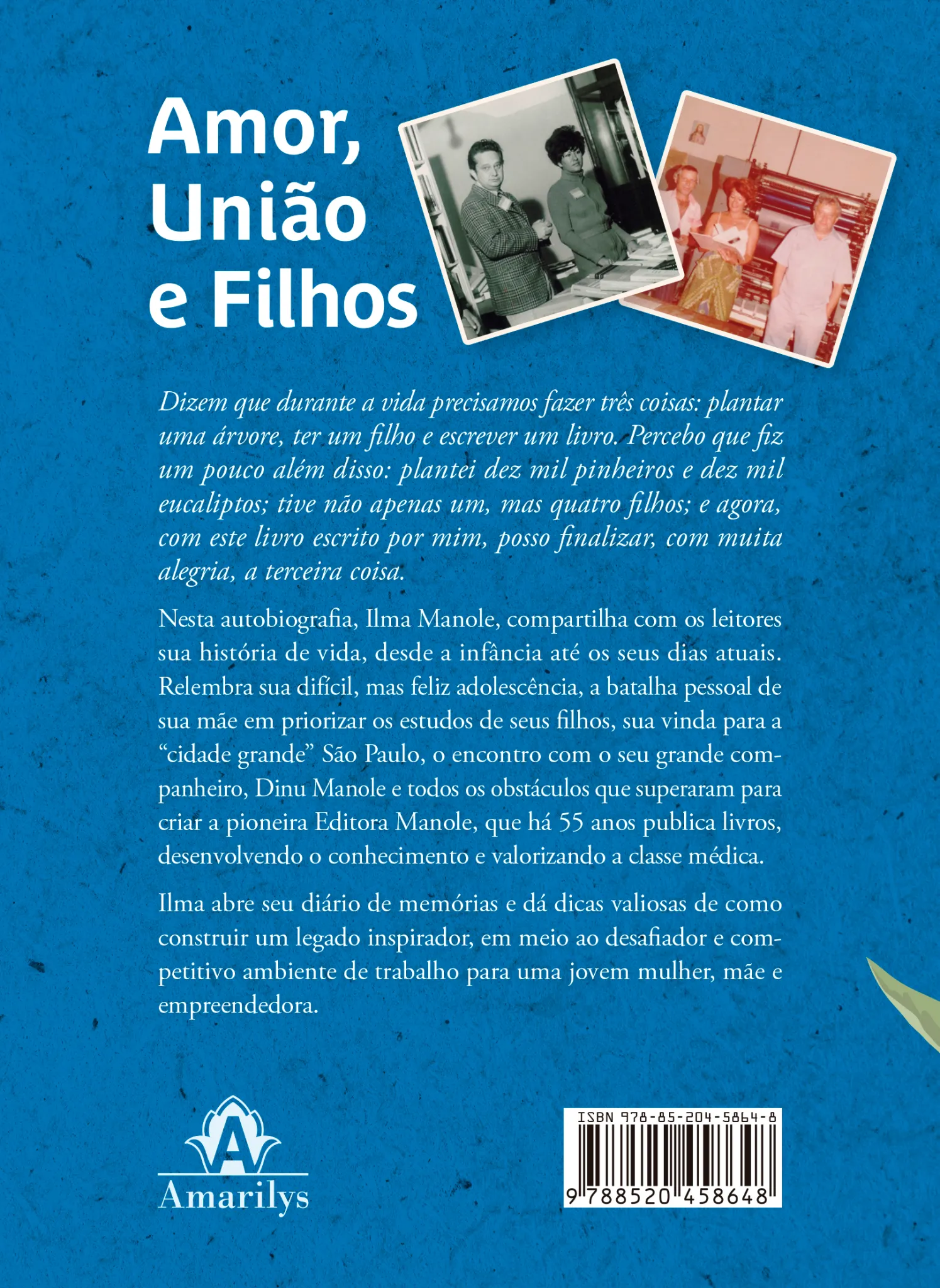 Relembra sua difícil, mas feliz adolescência, a batalha pessoal de sua mãe em priorizar os estudos de seus filhos, sua vinda para a “cidade grande” São Paulo, o encontro com o seu grande companheiro, Dinu Manole e todos os obstáculos que superaram para criar a pioneira Editora Manole, que há 55 anos publica livros, desenvolvendo o conhecimento e valorizando a classe médica.