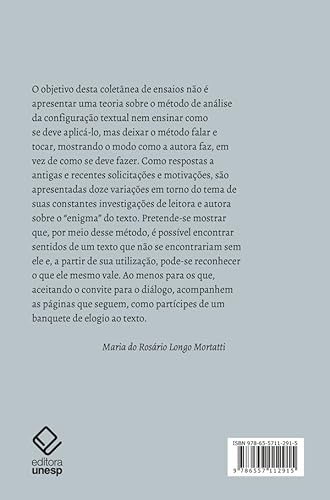O objetivo desta coletânea de ensaios não é apresentar uma teoria sobre o método de análise da configuração textual nem ensinar como se deve aplicá-lo, mas deixar o método falar e tocar, mostrando o modo como a autora faz, em vez de como se deve fazer. Como respostas a antigas e recentes solicitações e motivações, são apresentadas doze variações em torno do tema de suas constantes investigações de leitora e autora sobre o “enigma” do texto. Pretende-se mostrar que, por meio desse método, é possível encontrar sentidos de um texto que não se encontrariam sem ele e, a partir de sua utilização, pode-se reconhecer o que ele mesmo vale. Ao menos para os que, aceitando o convite para o diálogo, acompanhem as páginas que seguem, como partícipes de um banquete de elogio ao texto.