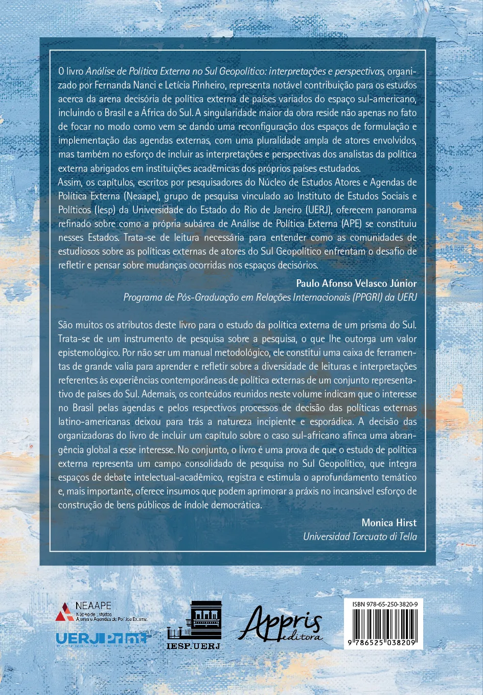 Assim, os capítulos, escritos por pesquisadores do Núcleo de Estudos Atores e Agendas de Política Externa (Neaape), grupo de pesquisa vinculado ao Instituto de Estudos Sociais e Políticos (Iesp) da Universidade do Estado do Rio de Janeiro (UERJ), oferecem panorama refinado sobre como a própria subárea de Análise de Política Externa (APE) se constituiu nesses Estados. Trata-se de leitura necessária para entender como as comunidades de estudiosos sobre as políticas externas de atores do Sul Geopolítico enfrentam o desafio de refletir e pensar sobre mudanças ocorridas nos espaços decisórios.