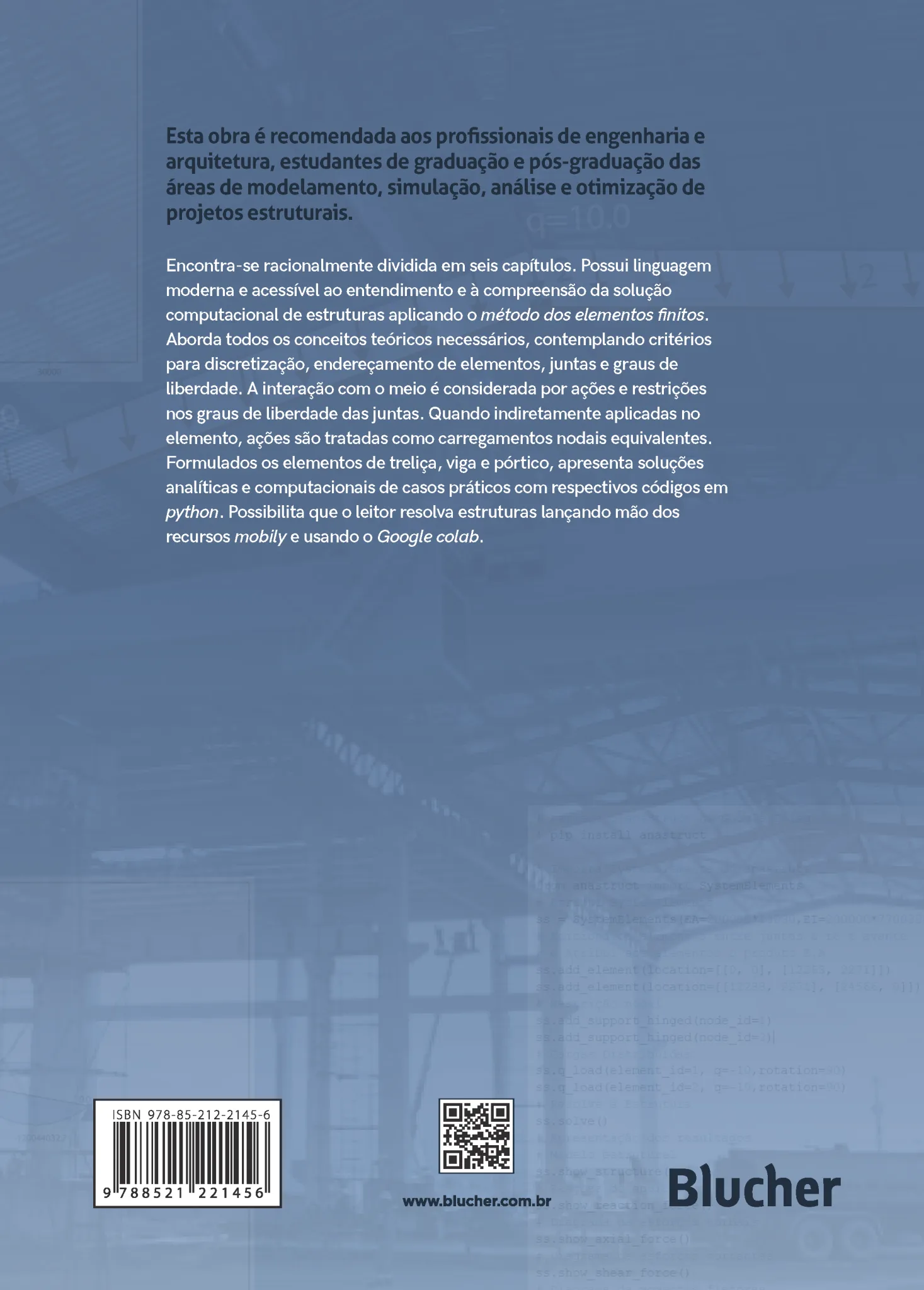 Esta obra é recomendada aos profissionais de engenharia e arquitetura, estudantes de graduação e pós-graduação das áreas de modelamento, simulação, análise e otimização de projetos estruturais.Encontra-se racionalmente dividida em seis capítulos. Possui linguagem moderna e acessível ao entendimento e à compreensão da solução computacional de estruturas aplicando o método dos elementos finitos. Aborda todos os conceitos teóricos necessários, contemplando critérios para discretização, endereçamento de elementos, juntas e graus de liberdade. A interação com o meio é considerada por ações e restrições nos graus de liberdade das juntas. Quando indiretamente aplicadas no elemento, ações são tratadas como carregamentos nodais equivalentes. Formulados os elementos de treliça, viga e pórtico, apresenta soluções analíticas e computacionais de casos práticos com respectivos códigos em python. Possibilita que o leitor resolva estruturas lançando mão dos recursos mobily e usando o Google colab.