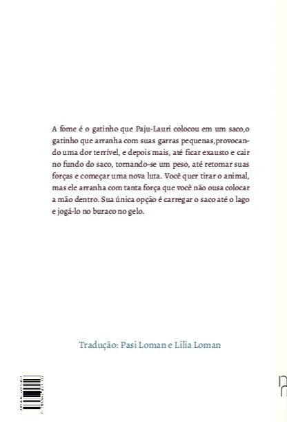 É 1867, ano de pouca colheita e de inverno especialmente rigoroso na Finlândia. Ano em que mais de 250.000 pessoas – 15% da população – morreram de fome. Um dos períodos mais dolorosos de sua história. Camponeses abandonam suas terras para tentar chegar a São Petersburgo, onde imaginam que há, pelo menos, pão. Esse pequeno livro trata da fome de forma simples e brutal. Num cenário gélido, as pessoas habitam o limite de sua humanidade. A fome cala e o silêncio que ela provoca é força motora da narrativa. Quem come fala em frases engasgadas. A vida resiste na força obstinada dos caminhantes e na escrita intensa do autor. O leitor brasileiro, através de uma narrativa delicada e fluida, tem a oportunidade de se emocionar e encontrar, num cenário muito diverso, questões, dificuldades e tensões que são universais, compartilhadas por povos de quaisquer lugares. A ficção, aqui, é a forma pela qual a realidade se expressa.