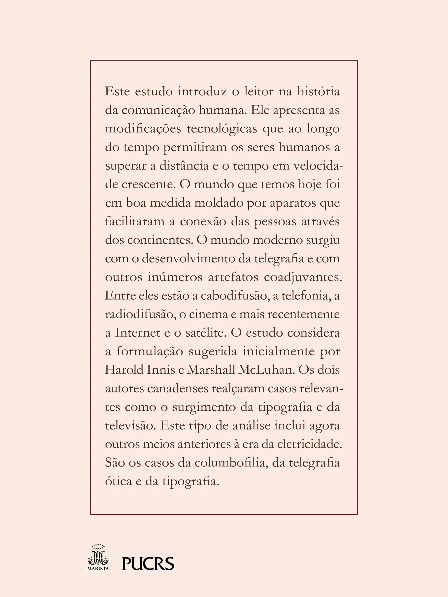 Este estudo introduz o leitor na história da comunicação humana. Ele apresenta as modificações tecnológicas que, ao longo do tempo, permitiram aos seres humanos superar a distância e o tempo em velocidade crescente. O mundo que temos hoje foi, em boa medida, moldado por aparatos que facilitaram a conexão das pessoas através dos continentes. O mundo moderno surgiu com o desenvolvimento da telegrafia e com outros inúmeros artefatos coadjuvantes. Entre eles, estão a cabodifusão, a telefonia, a radiodifusão, o cinema e, mais recentemente, a Internet e o satélite. O estudo considera a formulação sugerida inicialmente por Harold Innis e Marshall McLuhan. Os dois autores canadenses realçaram casos relevantes como o surgimento da tipografia e da televisão. Esse tipo de análise inclui agora outros meios, anteriores à Era da Eletricidade. São os casos da columbofilia, da telegrafia ótica e da tipografia.