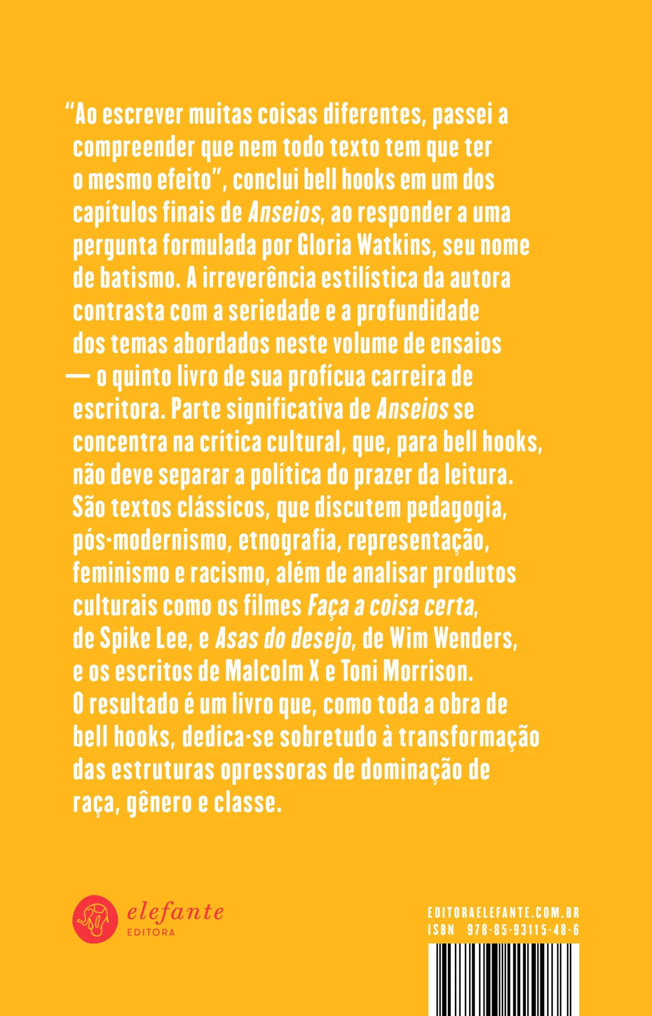 Para bell hooks, a melhor crítica cultural não considera necessário separar a política do prazer da leitura. Anseios reúne alguns dos primeiros e clássicos textos de crítica cultural publicados pela autora nos anos 1980. Abordando temas como pedagogia, pós-modernismo e política, bell hooks examina uma série de artefatos culturais, dos filmes Faça a coisa certa, de Spike Lee, e Asas do desejo, de Wim Wenders, aos escritos de Zora Neale Hurston e Toni Morrison. O resultado é uma coleção comovente de ensaios que, como toda a obra da autora, dedica-se sobretudo à transformação de estruturas opressoras de dominação.