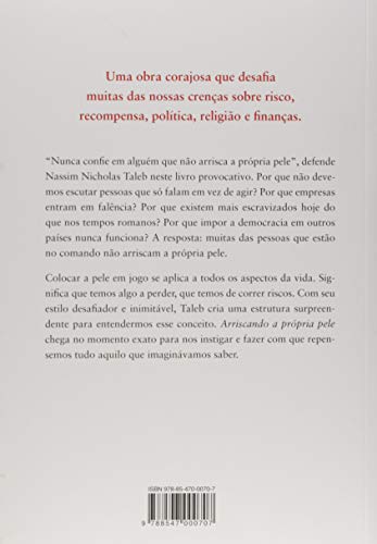 Best-seller do New York Times. Do mesmo autor de A lógica do cisne negro, uma obra corajosa, que desafia muitas das nossas crenças sobre risco, recompensa, política, religião e finanças. “Nunca confie em alguém que não arrisca a própria pele”, diz Taleb. Por que não devemos escutar pessoas que só falam em vez de agir? Por que empresas entram em falência? Por que existem mais escravos hoje do que nos tempos romanos? Por que impor a democracia em outros países nunca funciona? A resposta: muitas das pessoas que estão no comando do mundo não arriscam a própria pele. Neste livro provocativo, Nassim Nicholas Taleb mostra que colocar a pele em jogo se aplica a todos os aspectos da vida. Tem a ver com ter algo a perder e correr riscos. Em seu estilo belicoso e inimitável, Taleb cria uma estrutura surpreendente para entendermos esta ideia. Assim como A lógica do cisne negro na crise financeira de 2007, Arriscando a própria pele chega, em 2018, no momento exato para nos desafiar e nos fazer repensar tudo aquilo que imaginávamos saber.