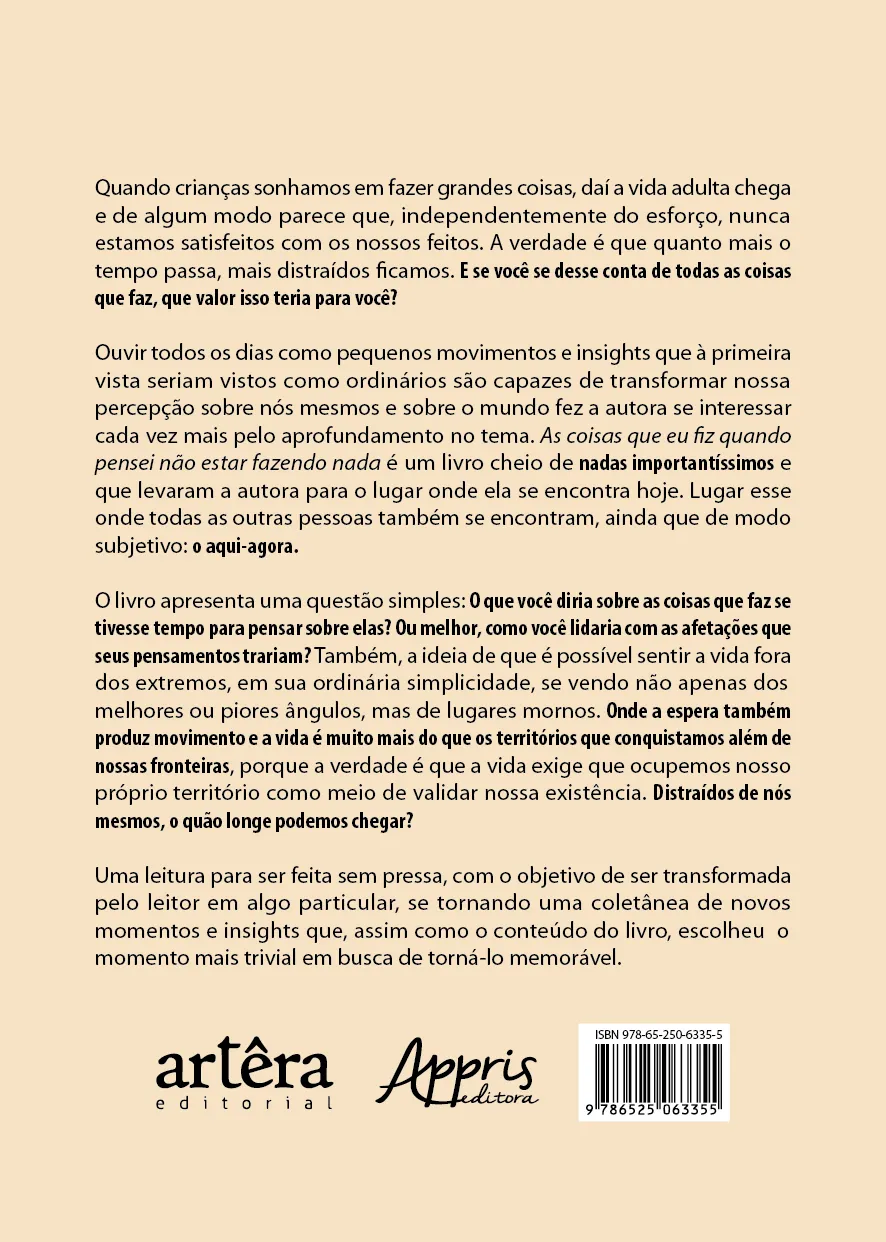 Quando crianças sonhamos em fazer grandes coisas, daí a vida adulta chega e de algum modo parece que, independentemente do esforço, nunca estamos satisfeitos com os nossos feitos. A verdade é que quanto mais o tempo passa, mais distraídos ficamos. E se você se desse conta de todas as coisas que faz, que valor isso teria para você? Ouvir todos os dias como pequenos movimentos e insights que à primeira vista seriam vistos como ordinários são capazes de transformar nossa percepção sobre nós mesmos e sobre o mundo fez a autora se interessar cada vez mais pelo aprofundamento no tema. As coisas que eu fiz quando pensei não estar fazendo nada é um livro cheio de nadas importantíssimos e que levaram a autora para o lugar onde ela se encontra hoje. Lugar esse onde todas as outras pessoas também se encontram, ainda que de modo subjetivo: o aqui-agora. O livro apresenta uma questão simples: O que você diria sobre as coisas que faz se tivesse tempo para pensar sobre elas? Ou melhor, como você lidaria com as afetações que seus pensamentos trariam? Também, a ideia de que é possível sentir a vida fora dos extremos, em sua ordinária simplicidade, se vendo não apenas dos melhores ou piores ângulos, mas de lugares mornos. Onde a espera também produz movimento e a vida é muito mais do que os territórios que conquistamos além de nossas fronteiras, porque a verdade é que a vida exige que ocupemos nosso próprio território como meio de validar nossa existência. Distraídos de nós mesmos, o quão longe podemos chegar? Uma leitura para ser feita sem pressa, com o objetivo de ser transformada pelo leitor em algo particular, se tornando uma coletânea de novos momentos e insights que, assim como o conteúdo do livro, escolheu o momento mais trivial em busca de torná-lo memorável.